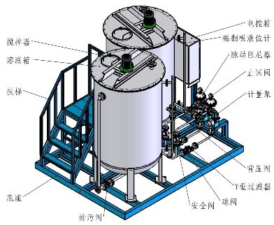 本公司生產(chǎn)的加藥裝置包括給水加氨、加聯(lián)胺、爐水加磷酸鹽、凝結(jié)水加氨以及循環(huán)水處理加藥、污水處理加藥等系統(tǒng)。加藥裝置主要是由控制系統(tǒng)、攪拌系統(tǒng)、溶藥罐、公共平臺(tái)和計(jì)量泵四部分組成,它的單元組合形式主要視用戶的不同要求而定一般為一箱兩泵一臺(tái)電動(dòng)攪拌器組成一整套系統(tǒng),亦可根據(jù)用戶要求,構(gòu)成兩箱兩泵,兩箱多泵,多箱多泵多種結(jié)構(gòu)